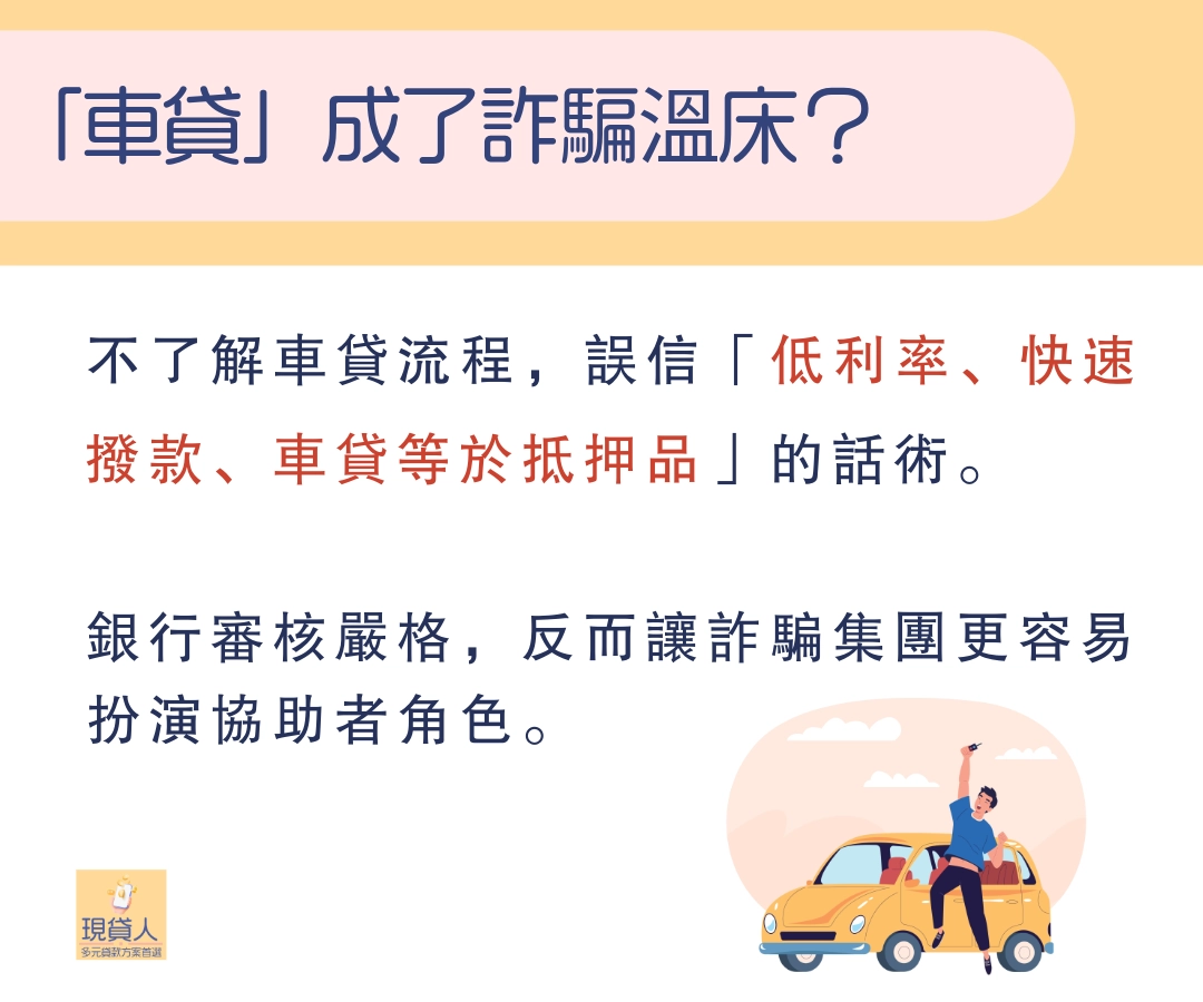 許多人不了解車貸流程,誤信「低利率、快速撥款」的話術;加上「車貸等於抵押品」,即使信用不好也能申貸,變成高風險族群的目標;