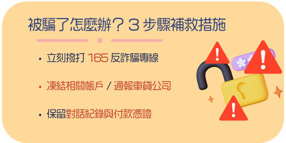 - 凍結相關帳戶/通報車貸公司:若已提供存摺或被貸款,立即與銀行與車貸公司聯繫,申請暫停相關業務。