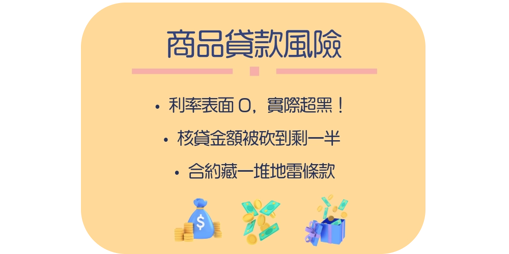不過,也正因為形式比銀行容易、快速,它也帶來一些需留心的風險:利率可能比一般銀行貸款高、費用透明度可能較低、合約條款可能藏有不利於借款人的條款。因此如果你考慮利用商品貸款,建議你細讀合約、確認所有費用(如:手續費、租賃服務費、提前還款罰金等)並評估自己的還款能力,避免未來因為形式簡便而落入負擔過重的困境。