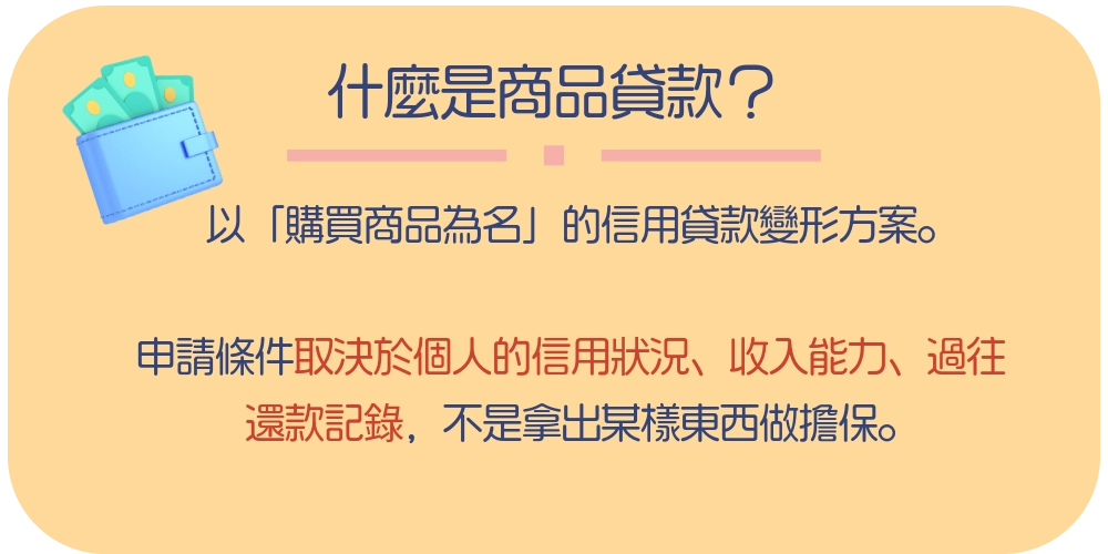 「商品貸款」其實是一種以「購買商品為名」的信用貸款變形方案。也就是說,你向業者申請時,看起來像是「我要買這項商品,所以需要分期付款」,但實際上往往 不需提供實體商品或抵押擔保品。你的申請條件主要取決於個人的信用狀況、收入能力、過往還款記錄,而不是你拿出某樣東西做擔保。