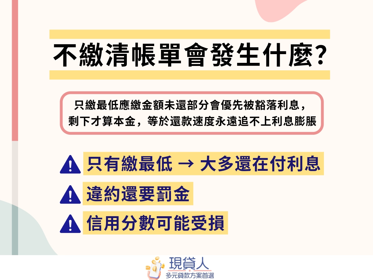 這種情況的恐怖之處是就算你下個月補足金額,也無法補回已經爆掉的信用紀錄與被吃掉的利息。