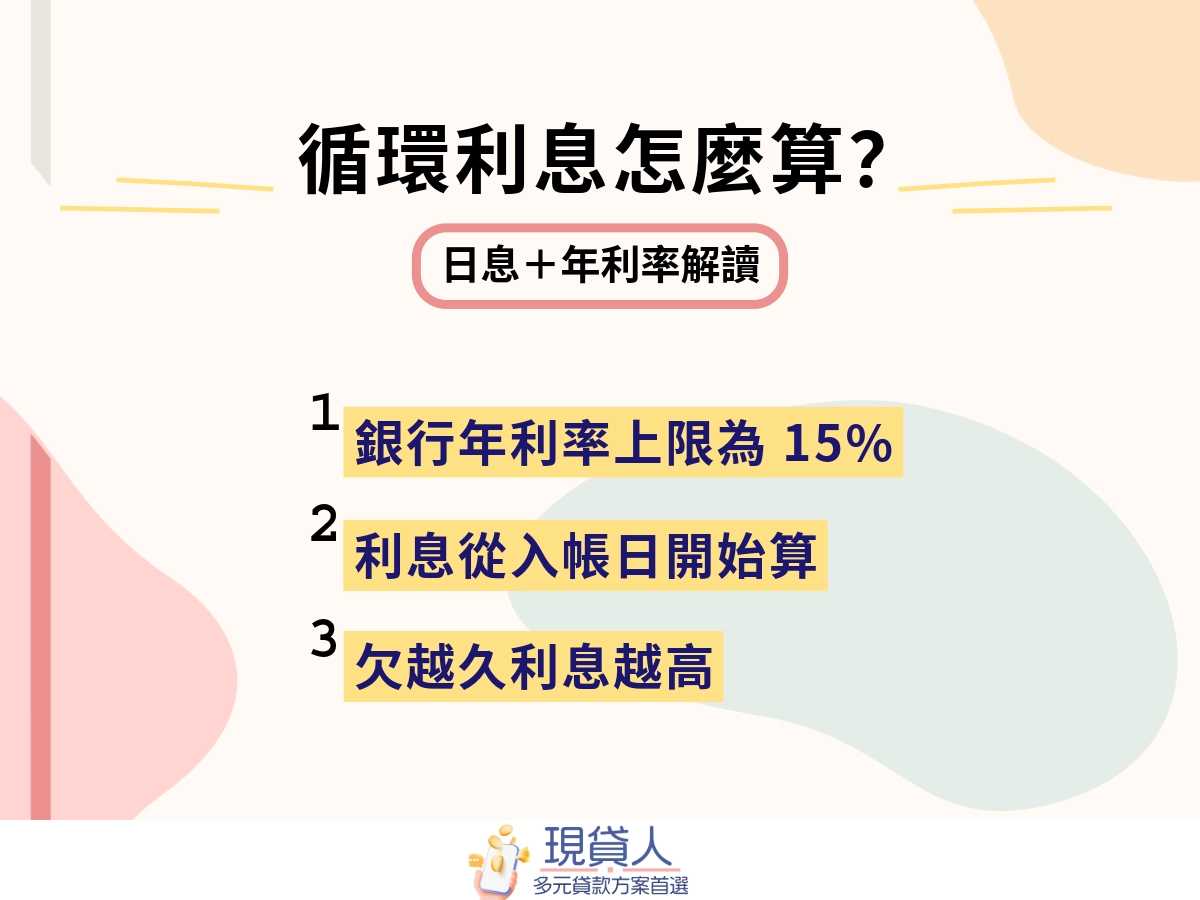 每家銀行的循環利息計算大同小異,根據〈信用卡業務管理辦法第 24 條〉,銀行每 3 個月需要重新確認持卡人的循環利率,且統一利率上限為 15 %。