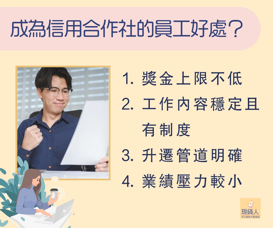 工作人際壓力低:不像銀行每天接待大量來客、要強推業績、盯死 KPI ,信用合作社來客穩定、有充裕的時間建立穩定的客戶關係。