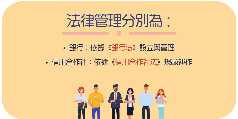 不管是銀行還是信用合作社,在法規上都被歸類為「金融機構」。只是,它們所依循的法律並不相同: