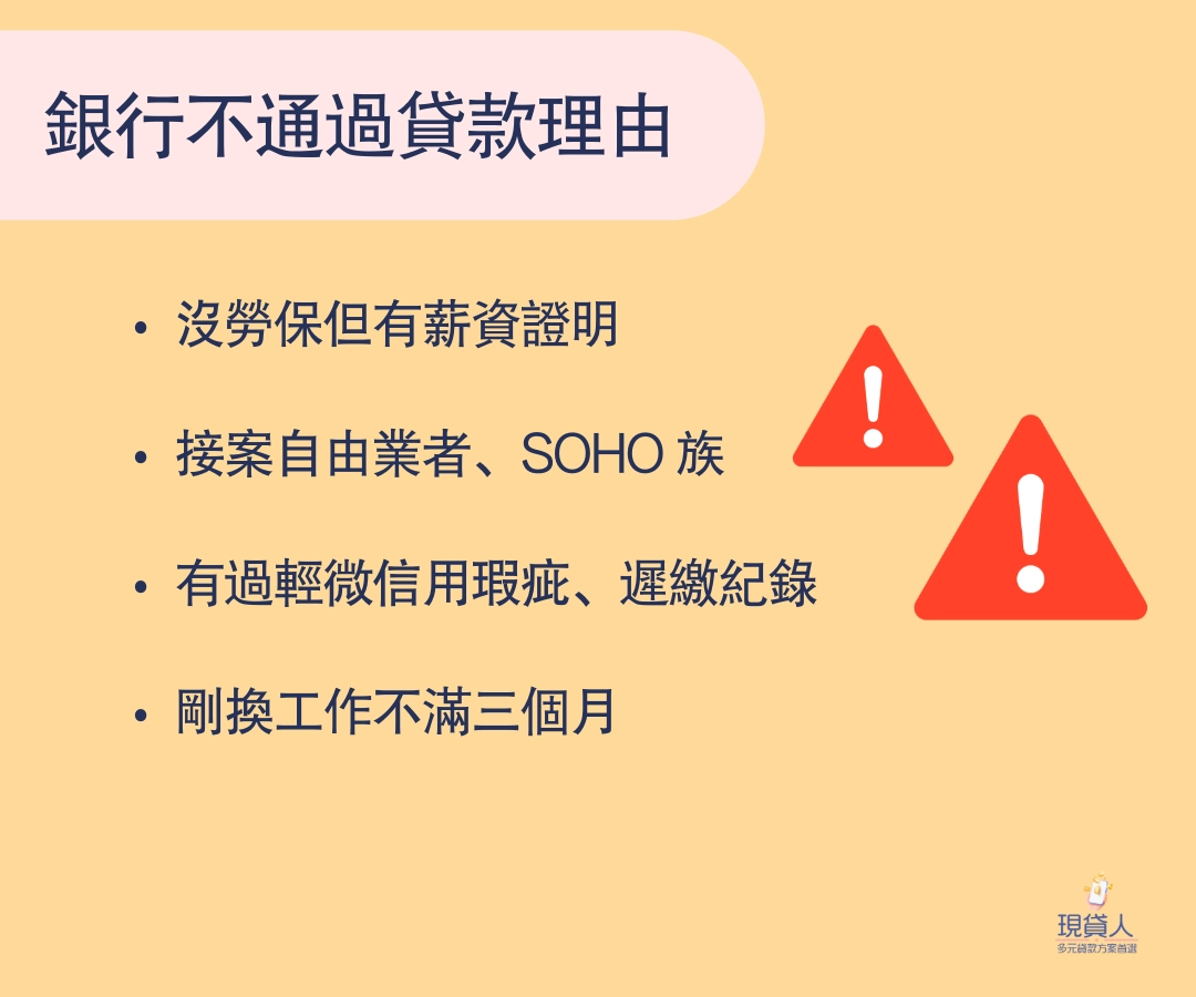 但缺點就是:不彈性、較機制化。只要你的工作型態、收入來源或信用紀錄不在「標準值」範圍內,基本上就會被拒貸。像是: