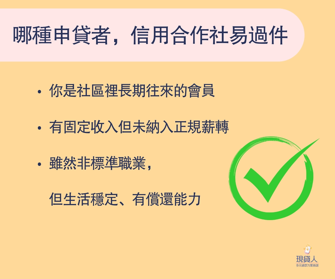 這類申貸者,在信用合作社反而比較容易過件,甚至利率還不會太高。這也是為什麼有人說「銀行不借時,不妨問問信用合作社」。