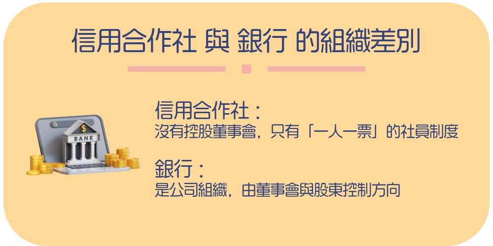 你也許會想,同樣能存錢貸款,為什麼有人偏好信用合作社,有人卻只信銀行?其實關鍵在於——它們的組織根本不一樣。