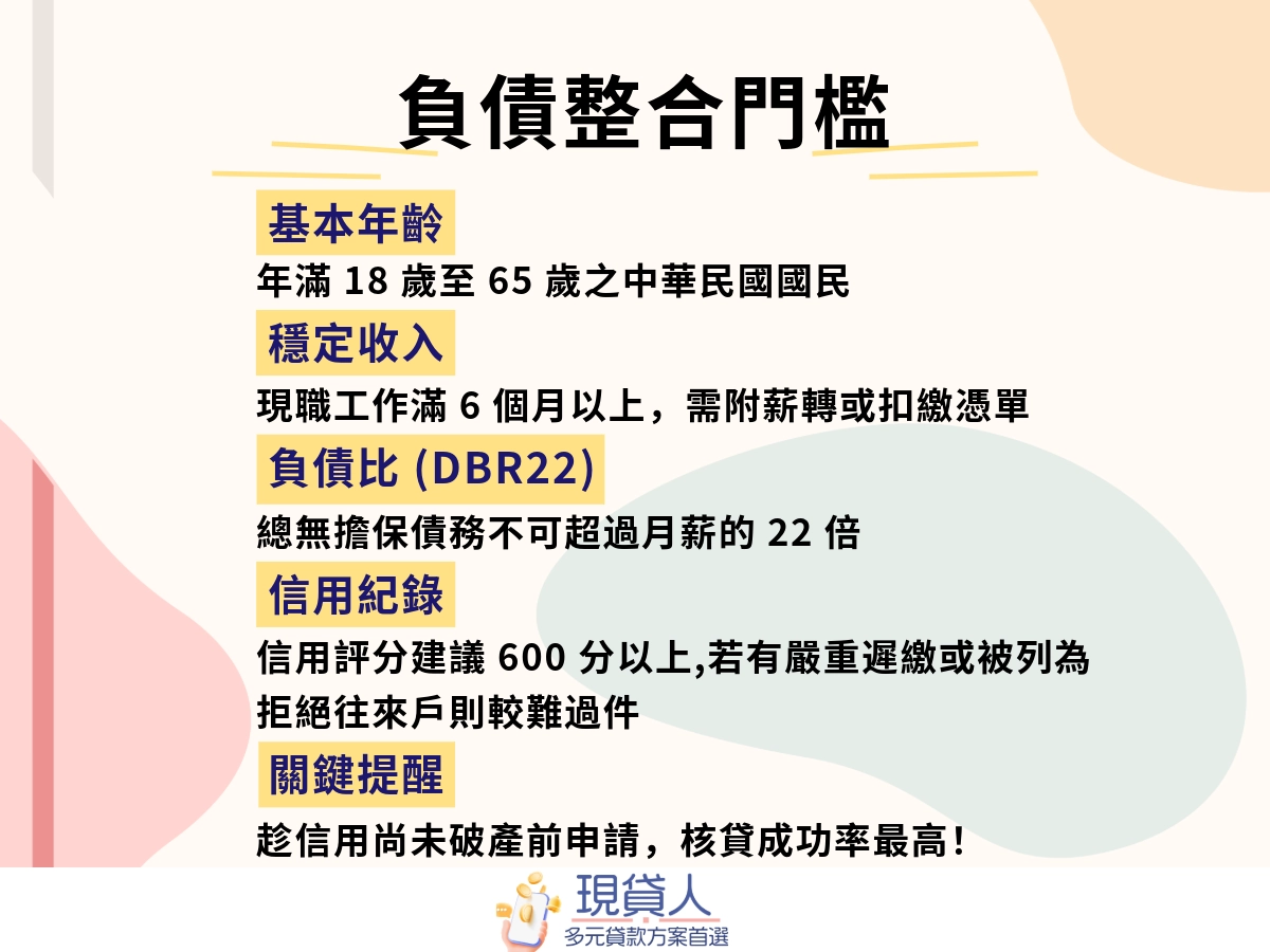 你想整合的金額、帳數越多,對財力與信用要求越嚴格。