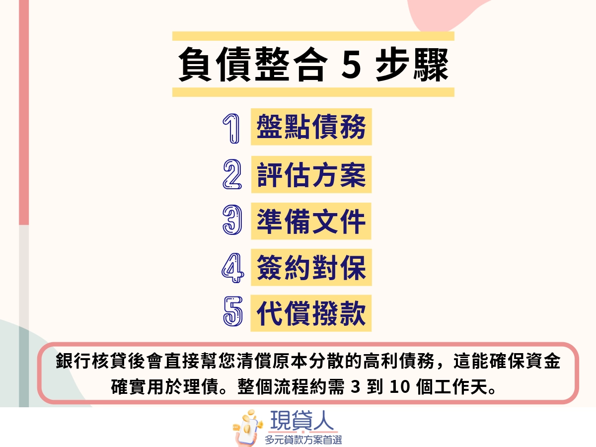流程簡單:找代書 → 債務盤點 → 提出整合方案 → 對保簽約 → 清償原債 → 新貸款開始還款
