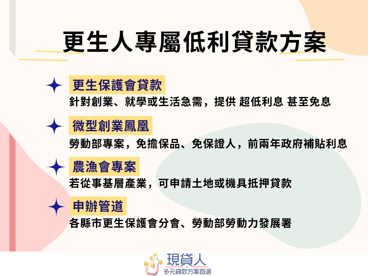 1. 更生保護會的圓夢創業貸款(最推薦、最低風險) 這是財團法人臺灣更生保護會專門幫更生人創業或就業的方案,無息或超低息,額度最高80萬(沒僱用更生人)到160萬(僱用更生人+提供不動產擔保)。