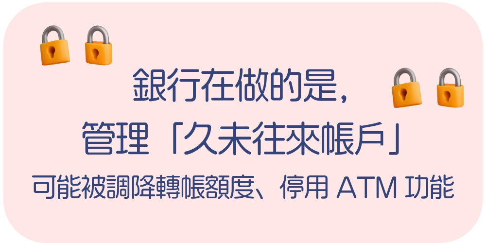- 久未往來帳戶:銀行現在實際在管的分類,會限制功能但不會凍結帳戶。