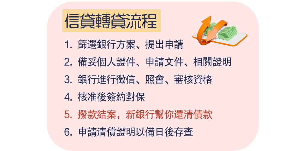簡單說,信用貸款轉貸就是把原本的信貸,換一家銀行重新借一次,拿新的貸款去還舊的那筆。