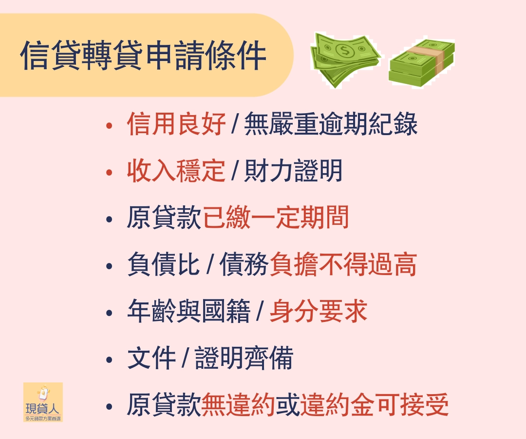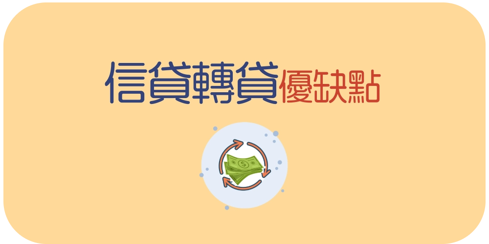「信用貸款轉貸」(有時也稱為信貸轉貸)是指你把目前在某家銀行/機構的信用貸款,透過申請新的貸款,把舊有的債務一次還清,然後在另一家銀行/貸款公司繼續繳款。把「原本的貸款」搬家、重新談條件的一種方式。