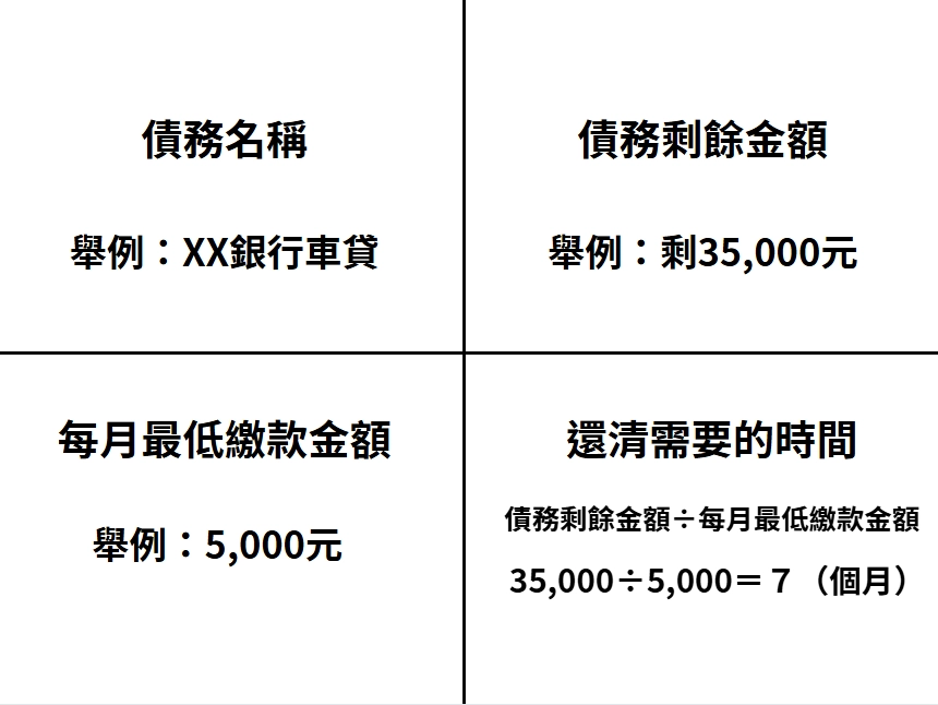 先把所有債務整理出來,包括名稱、剩餘金額、每月最低還款和預計還清時間,用十字象限方式呈現,這樣可以非常清楚每個貸款的情況。