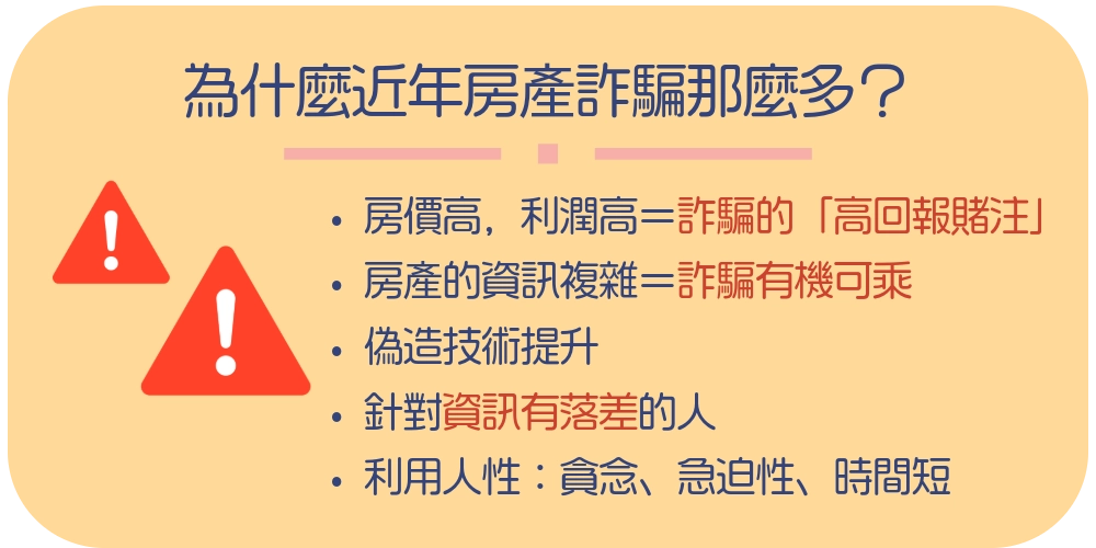 房產的資訊很複雜,因為涉及了法律、地政、金融等專業知識,如果沒有特別了解其實一般人都不太熟悉。而這正是詐騙集團有機可乘的地方。