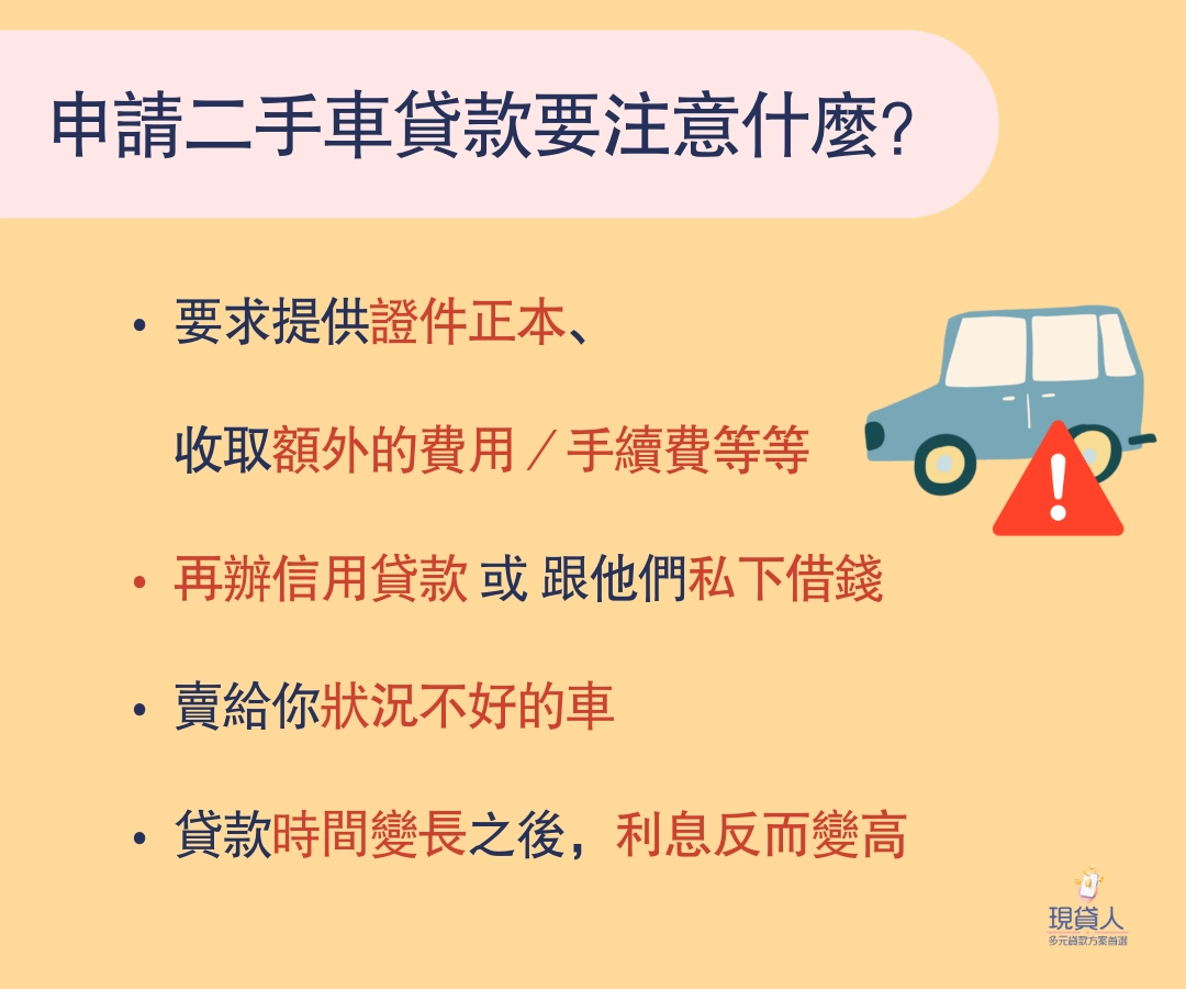 但要慎重選擇買二手車貸款的方案,了解清楚條件、流程、利率等等,主要是要找的方案符合自己能負擔的範圍。