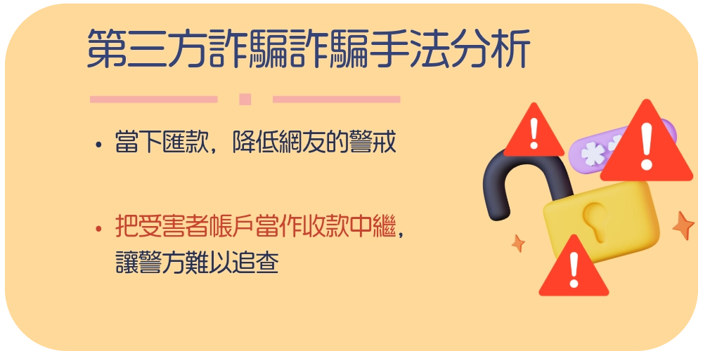 第三方詐騙不一定是買賣,可能是假求職、假交友、假投資、假借貸等情境,主要目的都是要讓你提供銀行帳戶,進而成為詐騙集團操作的工具。
