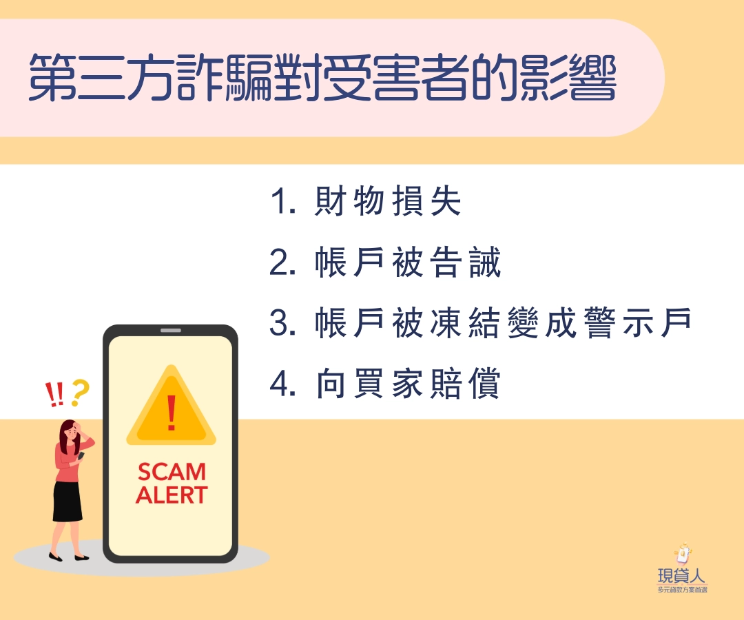 第三方詐騙不只是直接損失錢財,受害者還可能面臨帳戶凍結、法律責任甚至需要向受害人賠償,具體影響包括: