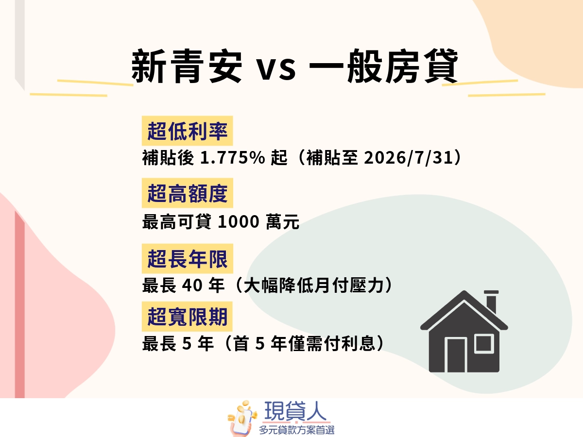 簡單來說,新青安就像是加大版的青安——借更多、還更久、前幾年壓力更小、利率更低。
