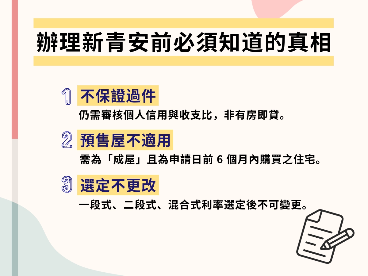 其實現行很多銀行內部本來就有類似的規定,只是沒有統一標準,這次是希望新青安 2.0 能把這條正式寫進去。